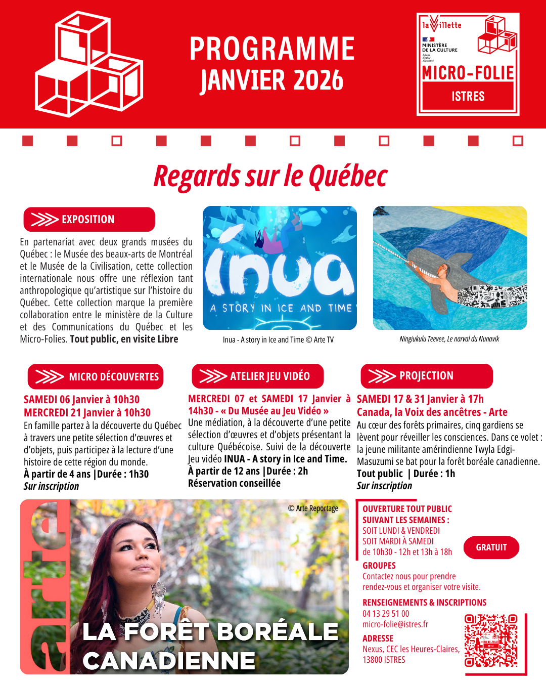 Et si l’hiver devenait une porte vers d’autres horizons ? Tout au long de janvier, la Micro-Folie du NEXUS vous embarque au cœur du Québec : grands paysages, voix autochtones, scènes de vie et créations d’aujourd’hui se répondent pour interroger mémoire, identité et rapport au territoire. On regarde, on explore, on joue - et l’on repart avec d’autres mondes en tête.